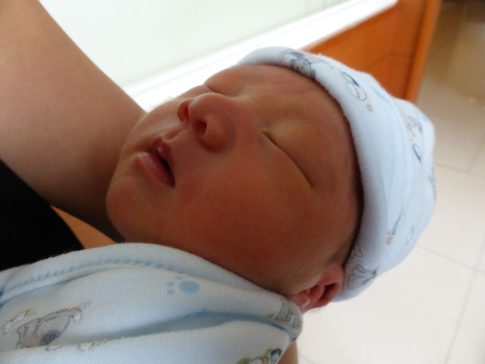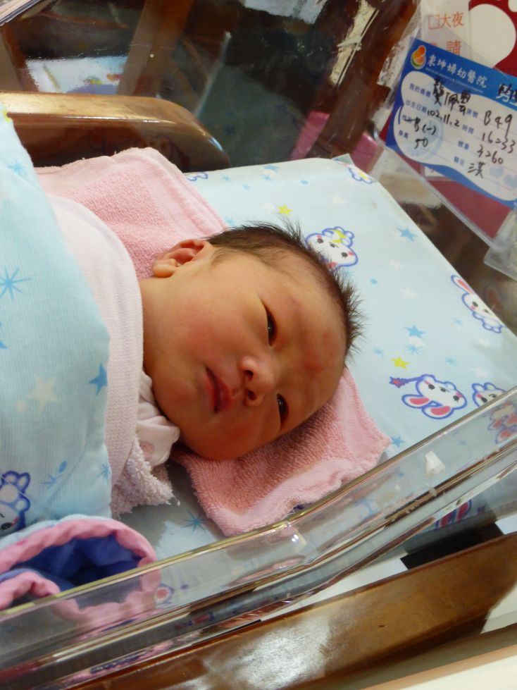 佩雲昨天大約3:30am就有感覺開始了。因知道是早階段,我們等到5:30am才去醫院。在醫院觀察一陣子,因為待產很多人護士說我們可先回去再等,才說沒多久羊水就出來了。又因為羊水出來,就這樣被綁在床上一直到12:45才開始進入生產的最後階段,可是又生不出來所以佩就一直辛苦到16:33(加上醫生的一小刀)才生。佩雲現在精神很好了但走路還有點困難,算是回復的很好了。貝比還沒帶出嬰兒房 (佩雲有去餵他幾次了),因為小兒科醫師剛剛才有機會去看,都沒問題。。。